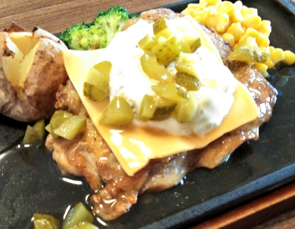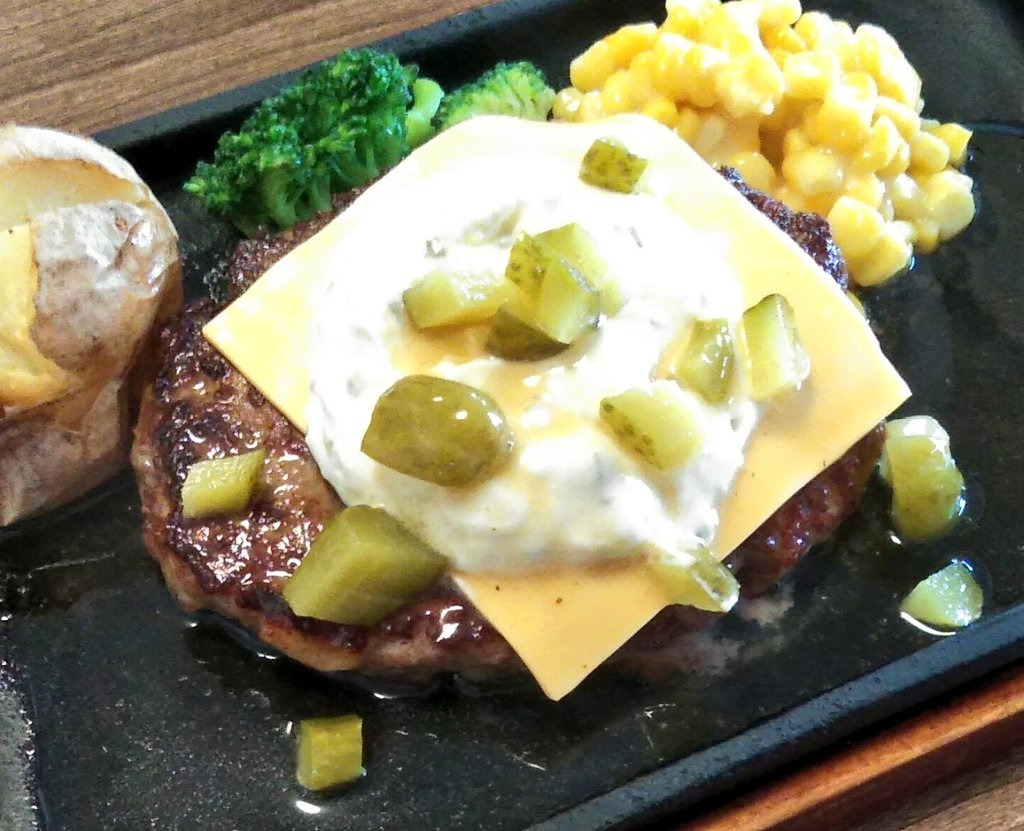 春の定番、タルタルソースのハンバーグ/チキンですが、今年はチェダーチーズとピクルスを乗せました!